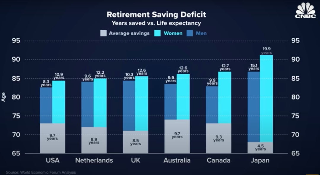 如今,人们的预期寿命越来越长,这也意味着,越来越多的退休人员会用完自己的退休储蓄。世界经济论坛的一项分析发现,男性的寿命比其退休基金可以支付的时间长8.3年,而女性的要长10.9年。