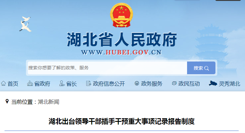 新华网2月16日消息显示,近日,湖北省委办公厅印发《湖北省领导干部插手干预重大事项记录、报告和责任追究办法(试行)》,就禁止领导干部插手干预重大事项及有关记录、报告和责任追究工作作出明确规定。