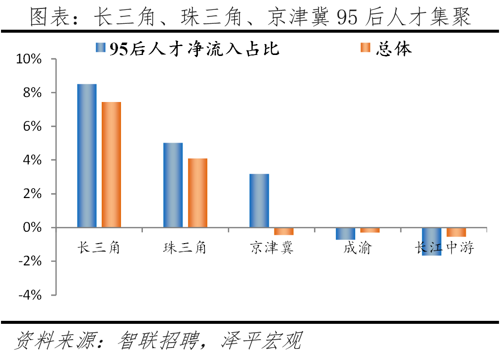 3)分城市群看,95后更倾向长三角、珠三角、京津冀95后人才集聚,成渝和长江中游净流出,其中五大城市群合计净流入占比为14.3%,远高于总体的10.2%。从人才净流入占比看,长三角、珠三角、京津冀对95后人才的集聚效应强于总体,净流入占比分别为8.5%、5.0%、3.2%,高于总体人才的7.4%、4.1%、-0.4%;95后人才在成渝、长江中游净流入占比分别为-0.7%、-1.7%,占比高于总体的-0.3%、-0.6%。95后和总体净流入五大城市群占比为14.3%、10.2%,95后更倾向往五大城市群集聚。中国“十四五”规划纲要提出优化提升京津冀、长三角、珠三角、成渝、长江中游五大城市群,它们以11%的土地聚集42%人口,创造53.5%的GDP,其中长三角、珠三角城市群是经济最活跃地区,经济占比合计达23.6%,95后年轻人更倾向有经济活力的地区。