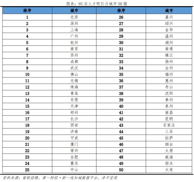 榜单概览:京深沪居前。1)中国最具95后人才吸引力城市50强:京深沪居前。95后年轻人才生长于经济高速增长时代,生活富足,更倾向工作发展和享受生活的平衡,选择就业城市不仅关注薪资,还关注创新环境和文娱产业发展情况。基于数据可得性,本文选取人均可支配收入、每万人专利授权数量和每百万人电影院数量作为外部指标,叠加智联招聘提供的95后人才流入占比、95后人才净流入占比、95后应届生人才流入占比、95后硕士及以上人才流入占比四个内部指标构建95后人才吸引力指数。从结果看,北京、深圳、上海位居前三,广州、杭州、南京、苏州、成都、武汉、佛山位居前十。2)细分指标解读:一二线城市吸引高学历人才、粤苏创新活力高。观察各分指标排名靠前的城市,在高学历方面,一线城市及成都、南京、杭州等强二线城市排名靠前;在收入方面,京沪及长三角区域城市更有优势;在创新方面,粤苏两地城市创新活力较强,深圳创新活力突出;在文娱方面,旅游城市三亚、拉萨排名靠前,带动整体指数排名跻身前50名。