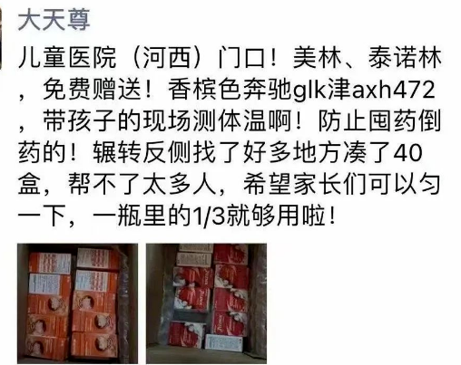 记得在天津儿童医院门口,有位开奔驰的大哥就凑了40盒退烧药,直接开车来到医院门口免费送药。