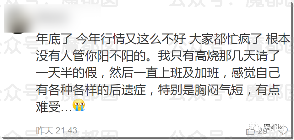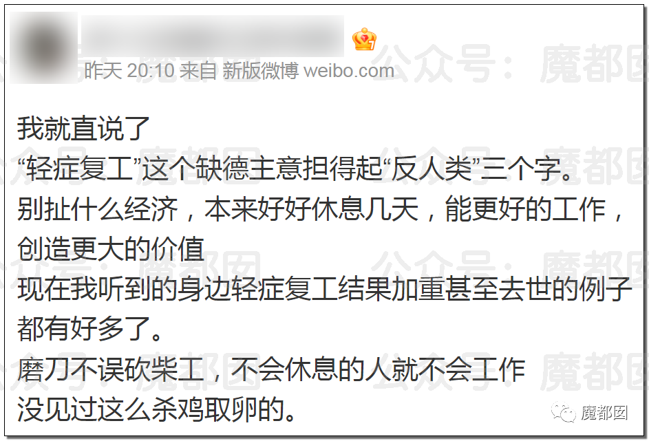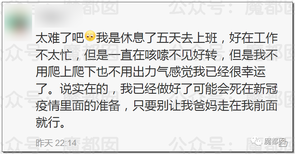 我们现在真的没有很多建议提供给大家,只能说请大家把身体健康摆在首位,那些逼你发烧咳嗽也要去工作的单位和领导可以考虑再见了,这点钱够你进几次ICU?(前提是进得了),网友非常愤怒: