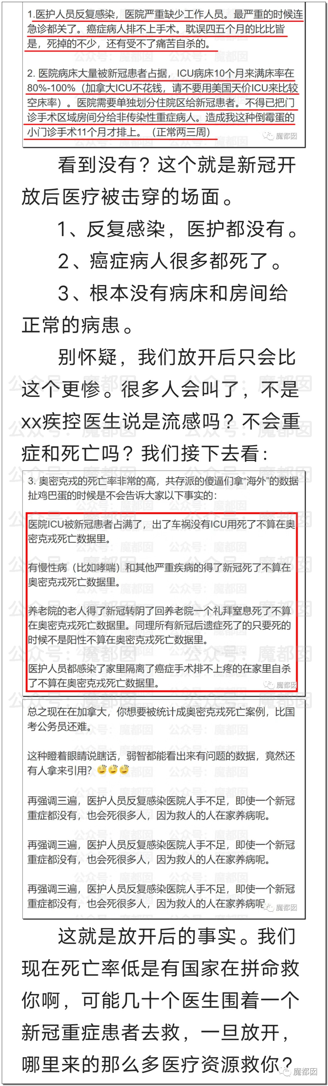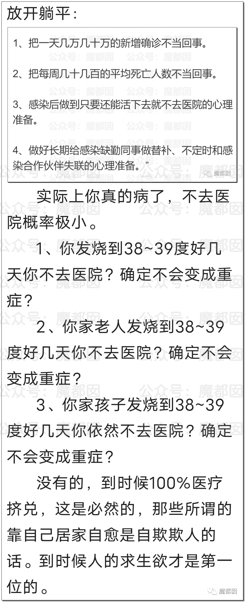 这是我们当时利用一位加拿大博主的案例分析,对于一旦躺平后医疗挤兑和被击穿的判断,注意,这是我们4月4日原文截图,没有修改过一个字: