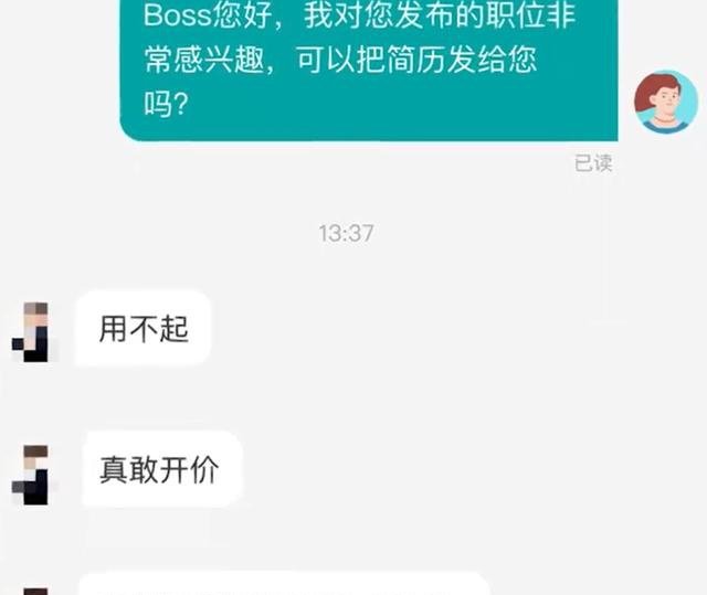 双方的聊天记录显示,该女生向HR表达求职意向后,对方竟直接回复道,“用不起,真敢开价,你觉得你能拿7千到1万?”