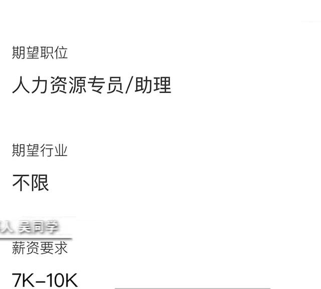 当事人吴同学称,自己目前是大四在读,想找一份实习工作。“校招的时候,有一家公司给出了7千块钱的底薪,之前想去一线城市工作,就把期望薪资改到了7千到1万。”