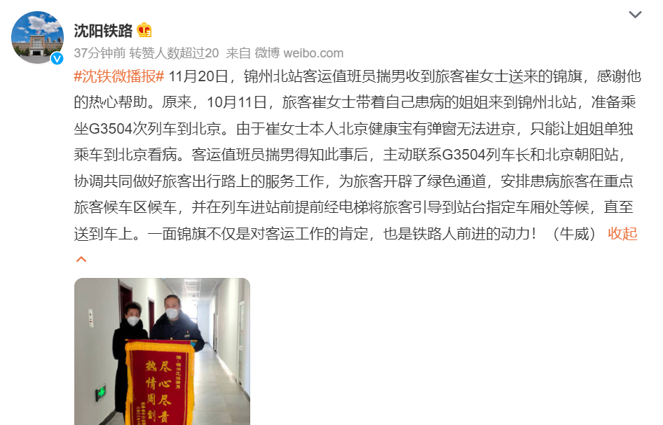 10月11日,旅客崔女士带着自己患病的姐姐从锦州北站准备乘坐G3504次列车到北京,但临上车前,崔女士的北京健康宝弹窗了,导致她无法进京,只能让姐姐单独乘车到北京看病。