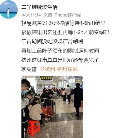 微博用户“二丫继续过生活”也发文表示,杭州东站落地核酸需要等待4—6小时出结果,待核酸结果出来后还要再等1—2小时才能转为绿码,其间需要在筛查处置区等待,她晒出的图片显示,等待转码的人不在少数。