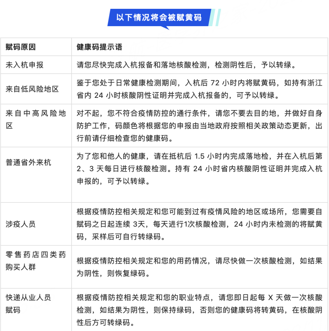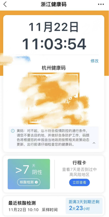 为了不影响出行计划,去杭州前,她专门做了出行攻略,了解到确实存在“赋黄码”的可能后,在小程序中进行了来杭人员信息报备,并提前一天赶到杭州。她还说,自己查攻略时发现,有人健康码显示“限制聚集”字样,但她暂时并未出现。而杭州要求的三天三检也并不包括落地检,当天需要再做一次。
