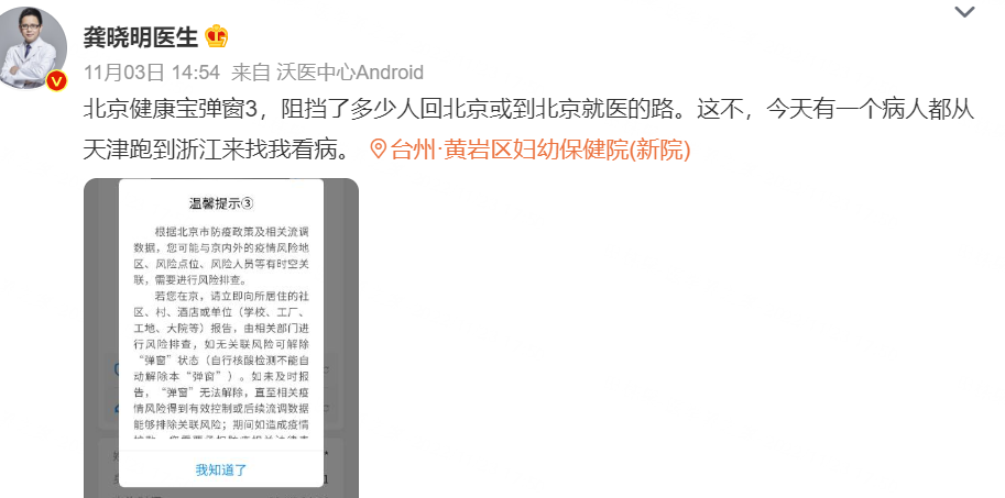 @龚晓明医生在微博发文感慨,北京健康宝弹窗3,阻挡了多少人回北京或到北京就医的路。