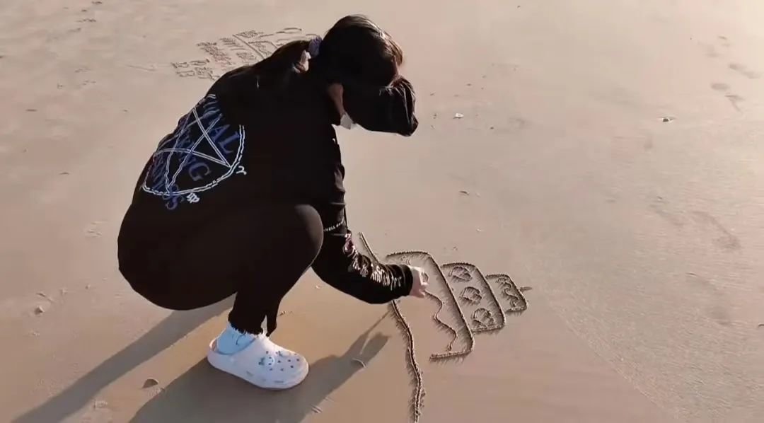 她每天要做的事情,就是伴随着海浪的击打声,用木棍在海滩上写下美好的祝福语,再把这些作品拍成照片或视频,发给顾客。
