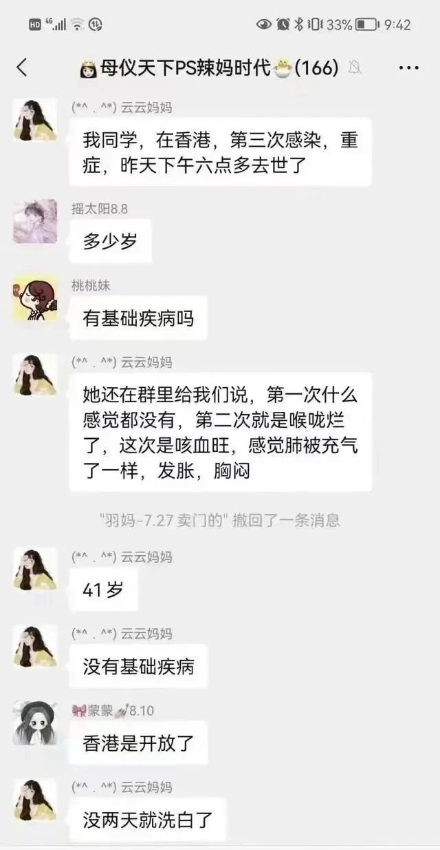 最近,一则显示为“小楠”发布的群聊天记录在微信朋友圈广泛流传。点开这份聊天记录显示,在一个名为“母仪天下ps辣妈时代”的166人微信群中,“云云妈妈”称,“我同学,在香港,第三次感染,重症,昨天下午六点多去世了。”