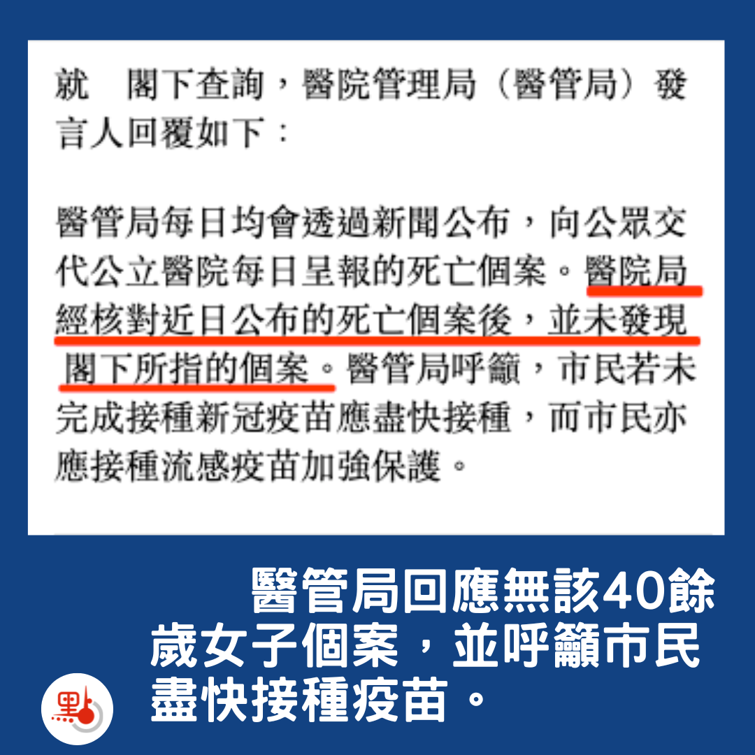 究竟有无此案例?11月29日,中国香港媒体【点新闻】向香港医管局查核该信息真伪,得到的回复是,医管局每日均会透过新闻公布,向公众交代公立医院每日呈报的死亡个案。医管局经过核对近日公布的死亡个案后,并未发现该个案。