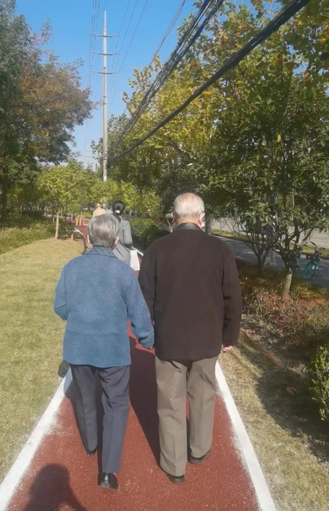 11月4日,Rachel带外公外婆在家附近的健身走廊上散步。图据新京报
