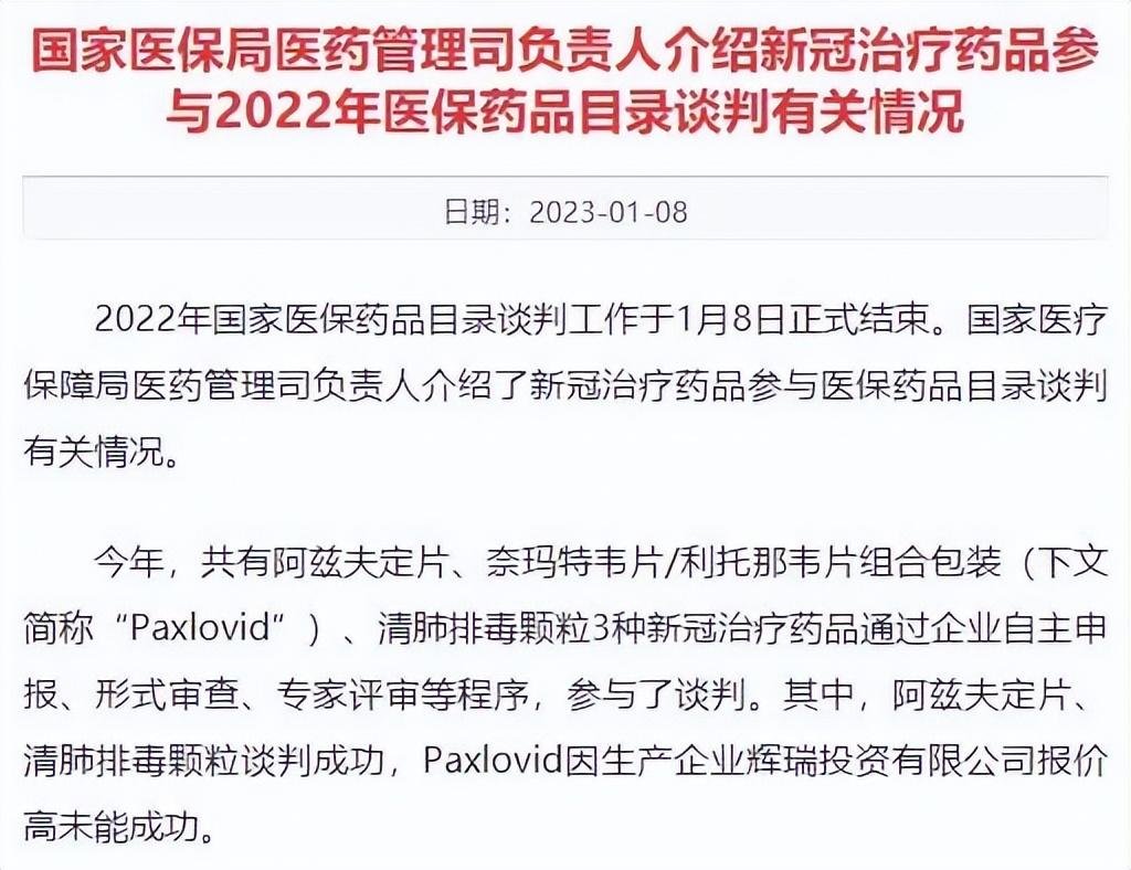 2022年国家医保药品目录谈判工作于1月8日正式结束。国家医疗保障局医药管理司负责人介绍了新冠治疗药品参与医保药品目录谈判有关情况。今年,共有阿兹夫定片、奈玛特韦片/利托那韦片组合包装(下文简称“Paxlovid”)、清肺排毒颗粒3种新冠治疗药品通过企业自主申报、形式审查、专家评审等程序,参与了谈判。其中,阿兹夫定片、清肺排毒颗粒谈判成功,Paxlovid因生产企业辉瑞投资有限公司报价高未能成功。[1]