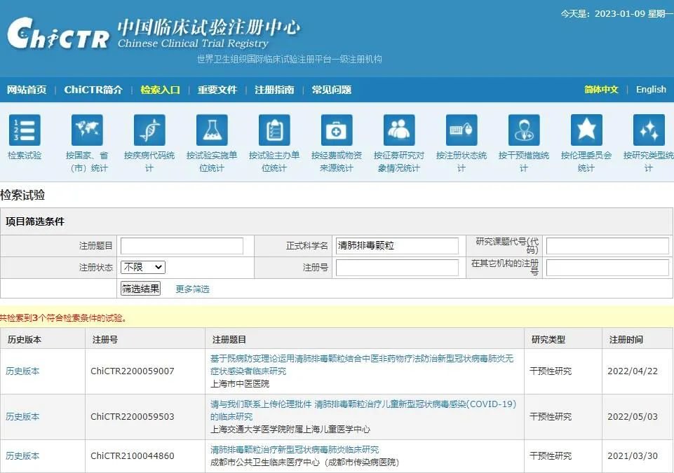 查询中国临床试验注册中心可知,清肺排毒颗粒注册了三次试验,其中2022年5月3日登记的这次试验,因为是针对儿童的,可能还没上传必备的伦理批件,被注册中心提醒“请与我们联系上传伦理批件”。