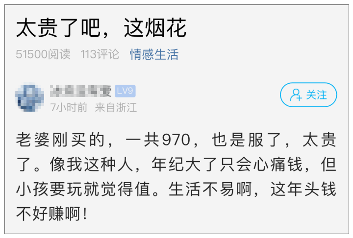 与此同时,一些网友感觉今年的烟花贵了。有个家住萧山的网友发帖:“老婆刚买的,一共970元,也是服了,太贵了……”不过,他也表示,虽然价格有点肉痛,但孩子天天吵着要放烟花,也值了,“其实自己也很想玩。”