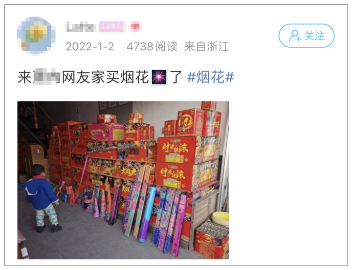 因为杭州主城区并没有开放烟花爆竹的销售和燃放,有些等不及的网友还专门开车去绍兴、富阳等地购买烟花,运回杭州后打算到春节期间燃放。