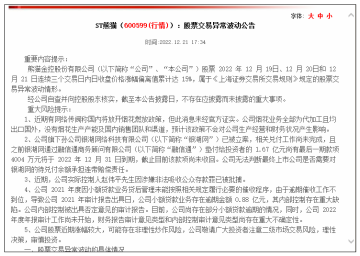 多地的烟花爆竹燃放新政,也激起了市场对“烟花概念股”的追捧。其中,ST熊猫作为国内唯一一家烟花上市公司,迅速吸引了大众眼球。2022年12月5日以来,ST熊猫在13个交易日内收获9个涨停板,阶段涨幅达40%。12月21日,ST熊猫发布当月第三次股价异动及风险提示公告:“国内将放开烟花燃放政策”未经官方证实,并重申公司烟花业务全部为代加工且均出口国外,没有烟花生产产能及国内销售团队和渠道,预计前述政策不会对生产经营和财务状况产生影响。