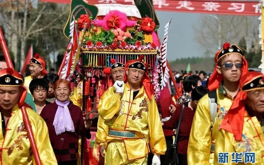 以笔者长期调查的山西洪洞县“接姑姑迎娘娘”活动为例。在汾河两岸有这样两个村民聚落,一个叫羊獬,一个叫历山。前者被认为是尧的行宫、二妃的娘家;后者被认为是舜和二妃(一说是二妃之一,另一个妃子在万安)的住处。每年农历三月三,羊獬村民从本聚落的神庙里,通过很隆重的仪式抬出二妃的驾楼(神轿),然后鸣锣开道、仪仗护持,更有“威风锣鼓”喧天动地,铳炮之声震耳欲聋,一支以男性为主的队伍很神圣地走出村庄,越过汾河,涌上历山,第二天又更加隆重地从历山神庙里接回两位圣母的小型神像,绕行万安住一宿,迤逦回到羊獬,这是上半段。到了四月二十八,历山等地的队伍又来到羊獬,将两位娘娘的神像迎回历山,二十九日万安队伍也来举行相似的迎娘娘仪式,途中热闹一如三月三。