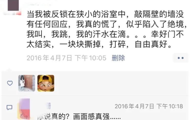许多和当事人有着一样经历的网友,也讲述了自己被困厕所又侥幸获救的惊心过程。