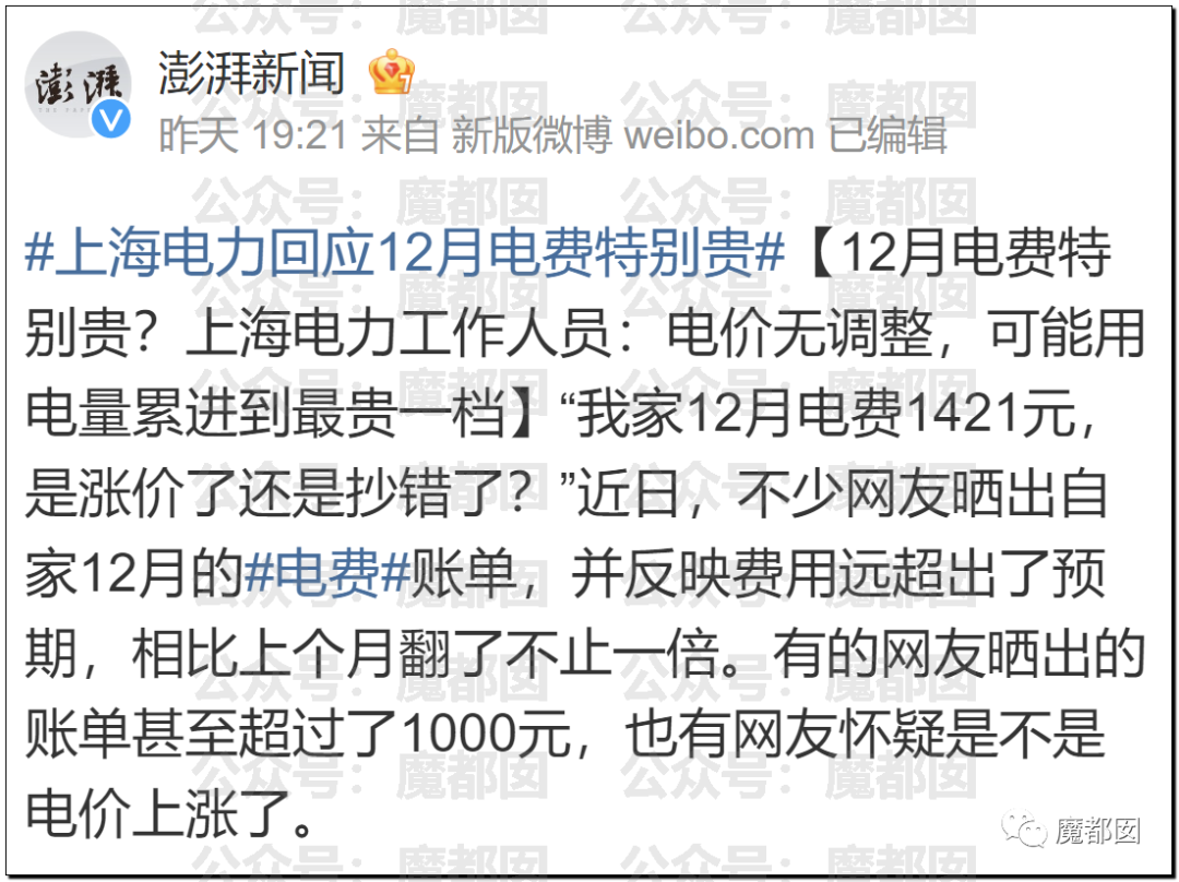 文章简介:这个事情引发轩然大波,而且更离谱的是在官方解释之后,依然很多网友表示无法接受……这就怪了……很简单,很多网友都发现12月份电费支出暴涨!直接爆上热搜:从阅读量大家就能发现这个事情不一般,因为超多网友发[db:内容简介]