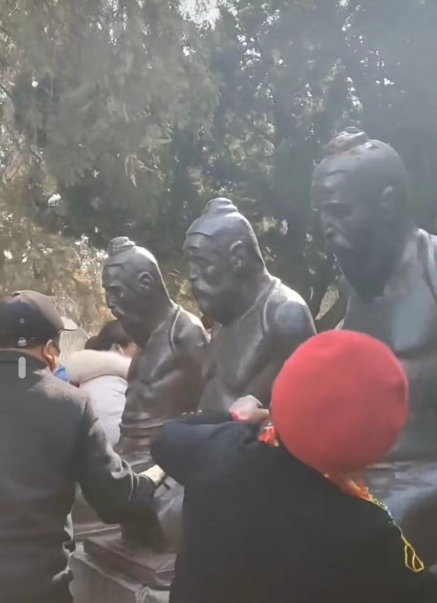 记者注意到,相关热传视频中,太昊陵景区内排起长队,队伍缓缓前行。来到秦桧等“五佞臣跪像”前,有游客上手击打铸像,还有拿鞋狠抽铸像面部的。视频拍摄者ID为“郑州甜心美妆供应链”的网友介绍,当地一直有着“打奸臣秦桧消灾免痛”的传统,电影《满江红》上映后,排队打“秦桧”的人也越来越多。