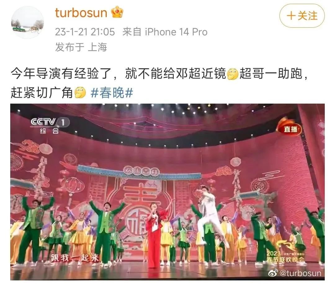 在台上旋转跳跃的超哥,贡献了一大波过年氛围,逗乐了观众不说,连娘娘都下场调侃:就不能给邓超近景,超哥一助跑,赶紧切广角。