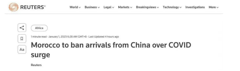 曾经对中国实行免签的摩洛哥也跳出来宣布,自2023年1月3日起,所有来自中国的人员,不论国籍,皆不得入境该国,“以避免出现新的新冠病毒感染浪潮”。
