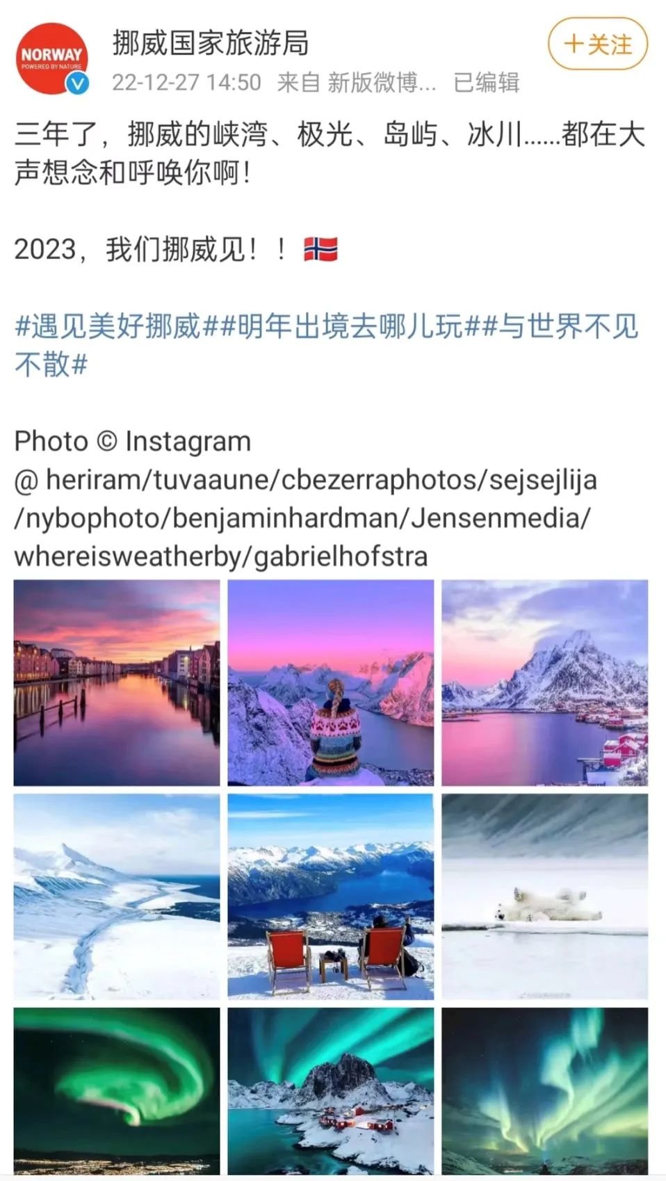 挪威国家旅游局:“挪威的峡湾、极光、岛屿、冰川……都在大声想念和呼唤你啊!”