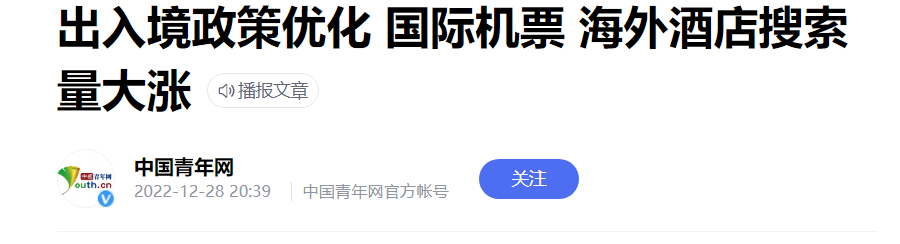 当“乙类乙管”的方案发布后,国内旅游平台上各种出境机票、海外酒店等搜索迅速上涨,其中携程平台上,热门海外目的地酒店搜索量同比涨了10倍;同程旅行上,海外热门国家机票瞬时搜索量增长850%。