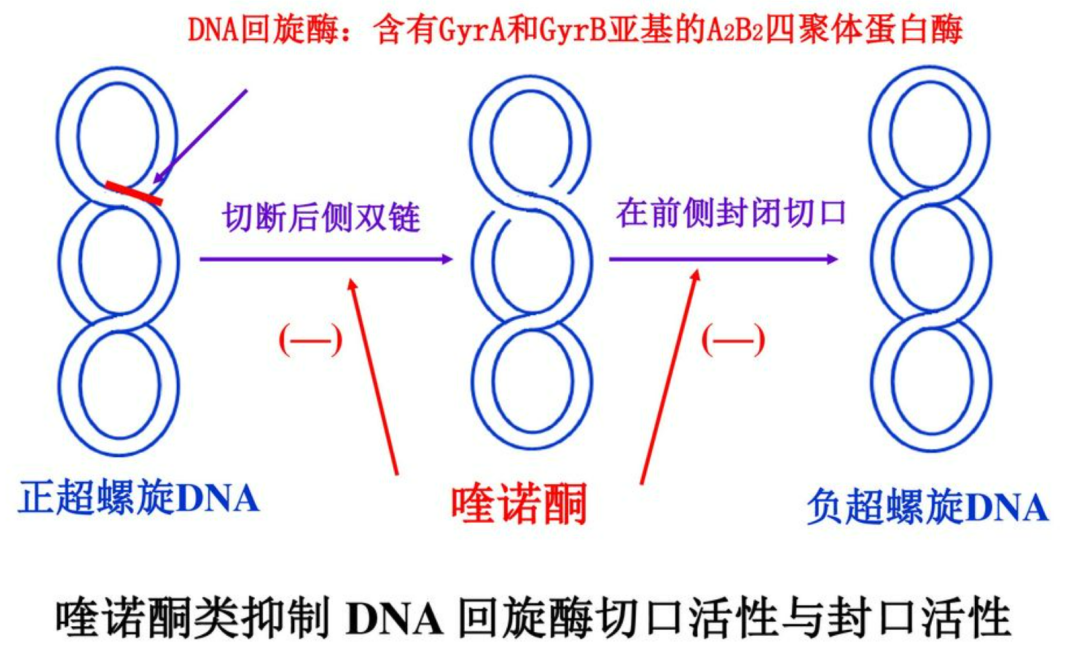 由于喹诺酮类药物抑制了DNA回旋酶活性,导致新复制出来的细菌DNA不能拧成稳定的麻花状态进入下一轮复制,从而起到抗菌的作用。