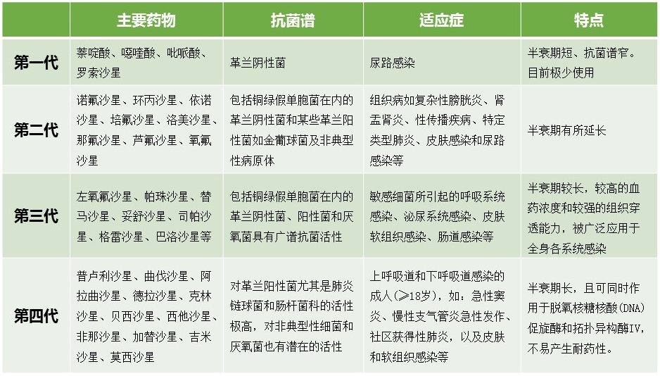 第一代的萘啶酸、吡咯酸等由于疗效差,已经很少使用。目前,后三代常见的药物主要有: