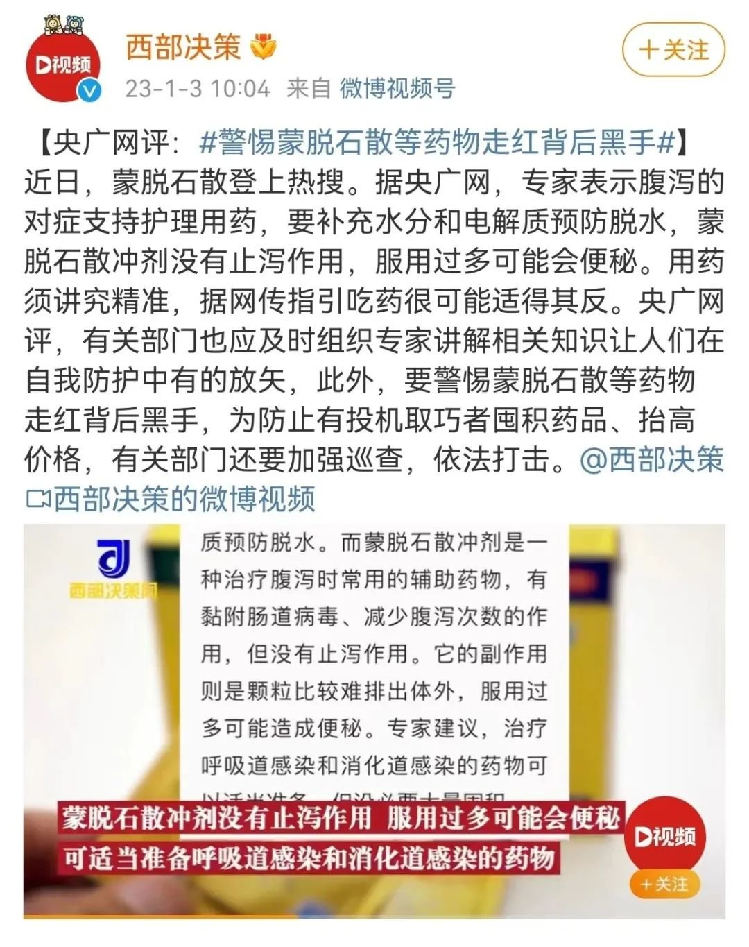因此,蒙脱石散等药物的走红,央广网评警惕其背后有“黑手”推动、投机取巧,这种怀疑合情合理。