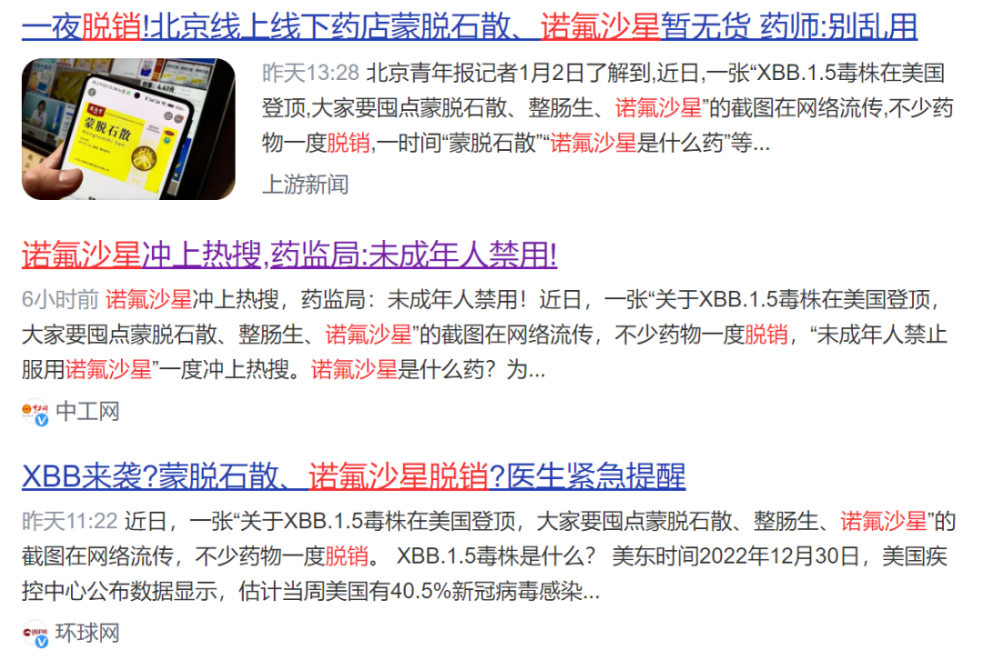 2023年1月1日,元旦当天,各地药店蒙脱石散因遭抢购、脱销,而登上了微博热搜榜首。同样遭到抢购的诺氟沙星等止泻药,也很快成为热搜话题。