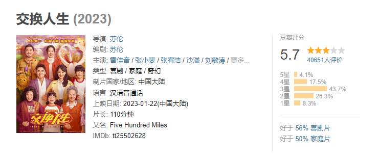 可惜的是,这次春节档,张小斐未能复刻前作“内地影史票房第二”的成绩,反到以尴尬的喜剧情节,成为今年春节档的“炮灰”——《交换人生》豆瓣评分5.7,成为春节档最低分作品。