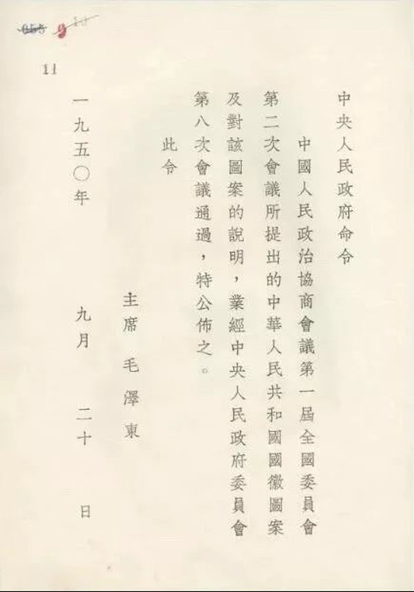 1950年9月20日,中央人民政府主席毛泽东签署主席令,公布国徽图案及对国徽图案的说明。中国政协文史馆提供。