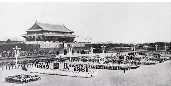 1961年国庆游行仪仗队“建国第二年起,每年五一节和十一国庆节,天安门前都会举行盛大游行。我担任仪仗队和文艺大军的队容美术总设计,标语牌、彩车、花,每次先画出一副队形长卷,中间要监工,预演时要上天安门城楼看总体效果,成千上万的人,手上拿花,先是百花齐放,从天安门上看去,杂乱呈灰色。其后我们将颜色分队,一队一色,服装、标语牌都注意远看的彩色效果,一次比一次美。”