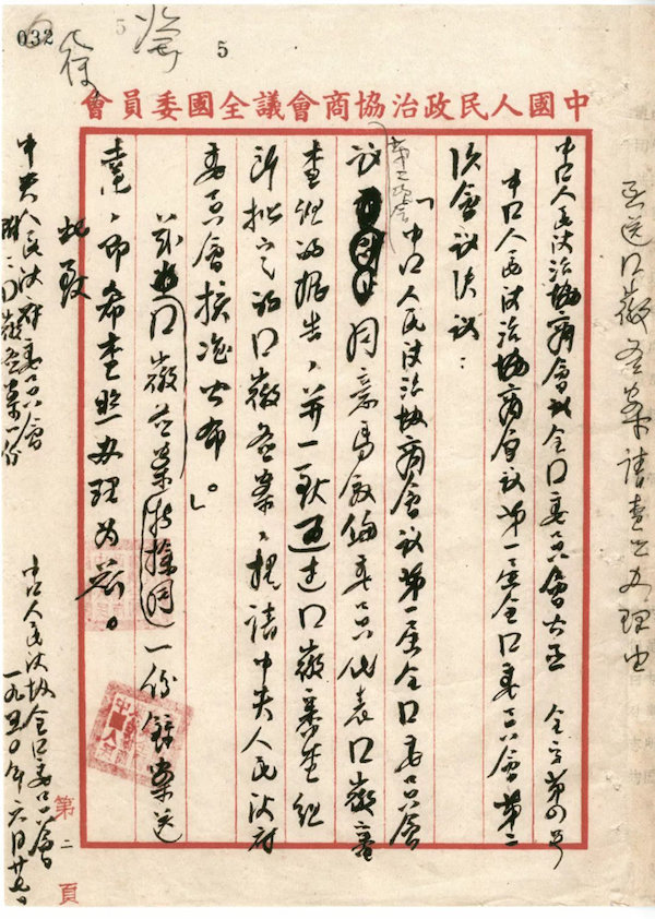 中国人民政治协商会议第一届全国委员会第二次会议关于国徽的决议文(复制件),18.9x25.9厘米,中国政协文史馆提供