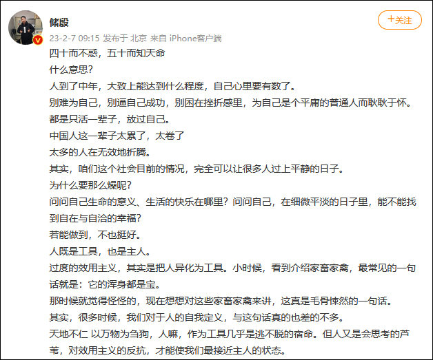 储殷称“35岁后做废物很舒服”引热议,本人回应