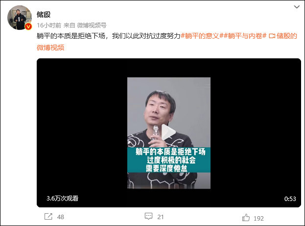 此前,储殷还发布视频表示,躺平的本质是拒绝下场,过度积极的社会需要深度倦怠。