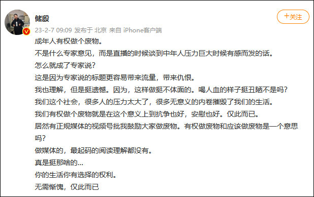 2月6日,储殷在社交平台上说,“成年人有权做个废物。我们不希望孩子是废物是因为他们还有未来,过了35岁以后做废物还是挺舒服的。中年人要安于做个废物,到了老年不要因为自己是个废物而心怀惭愧。老了没用就没用了,有什么不好意思的呢?”