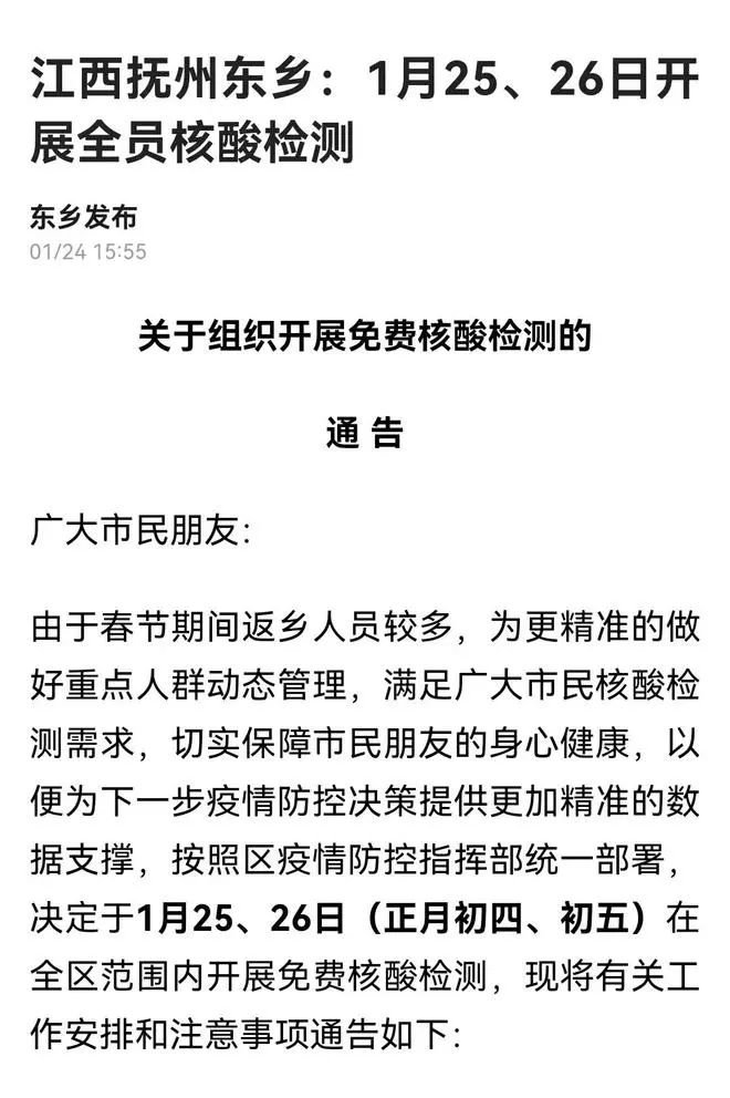 万万没想到,就在今天(1月24日),江西省抚州市东乡区新冠肺炎疫情防控应急指挥部办公室发布了一则《关于组织开展免费核酸检测的通告》称: