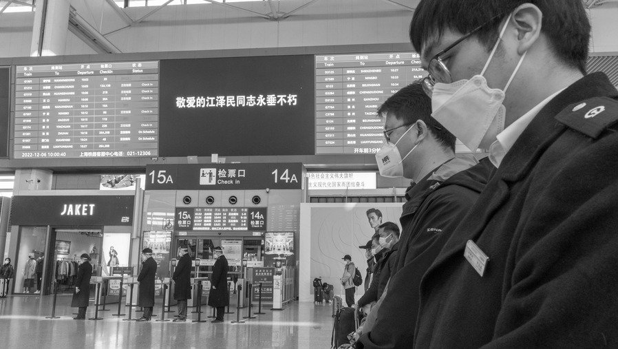 上午10时整,高铁动车、汽车鸣笛声和防空警报鸣响声交织响彻铁路上海站上空。“请各位旅客起立,默哀。”在车站广播的提示下,各候车室、售票厅的旅客纷纷起立、驻足,低头肃立,向敬爱的江泽民同志表达深切哀悼。