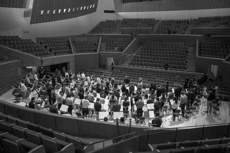 上海交响音乐厅舞台上,上海交响乐团音乐总监余隆一个手势,全体乐手起立,为江泽民同志默哀。排练被推迟了,总是音乐环绕的大厅,这一刻宁静肃穆。
