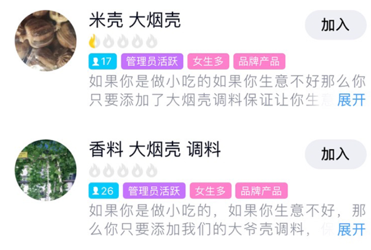 除了当面线下交易的药材贩子,还有药材商通过QQ群推销自己的罂粟壳,只不过这些QQ群更像是创业开店的交流群:“如果你是做小吃生意的,如果你是做熟食生意的,像麻辣烫、烧烤,如果你生意不好,那么你只要加入了我们的调料,保证你生意红火起来。”