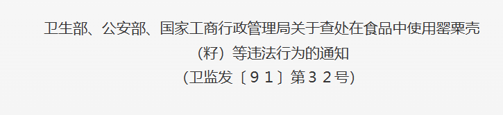 于是,1991年8月,卫生部、公安部、国家工商行政管理局发布了《关于查处在食品中使用罂粟壳(籽)等违法行为的通知》,其中提到“极少数食品生产经营者,特别是个体食品经营户为牟利……在食品中大肆使用罂粟壳(籽),以招徕生意,影响极坏,危害极大,且有日益扩散、蔓延的趋势,必须依法从严从快惩处”。