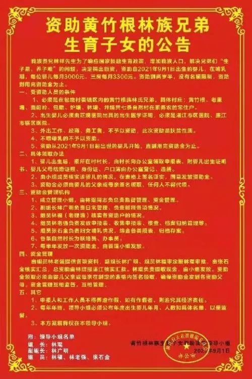 早在2017年3月,广东廉江营仔镇包墩行政村黄竹根(以下统称“黄竹根村”)就发布了全国第一个实施生育补贴,只要有村民生了一个孩子,便一次性发放3万现金补贴。