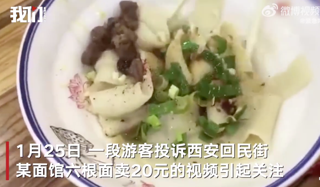 据新京报“我们视频”报道,1月25日,一段游客投诉西安回民街某面馆6根面卖20元的视频引关注。