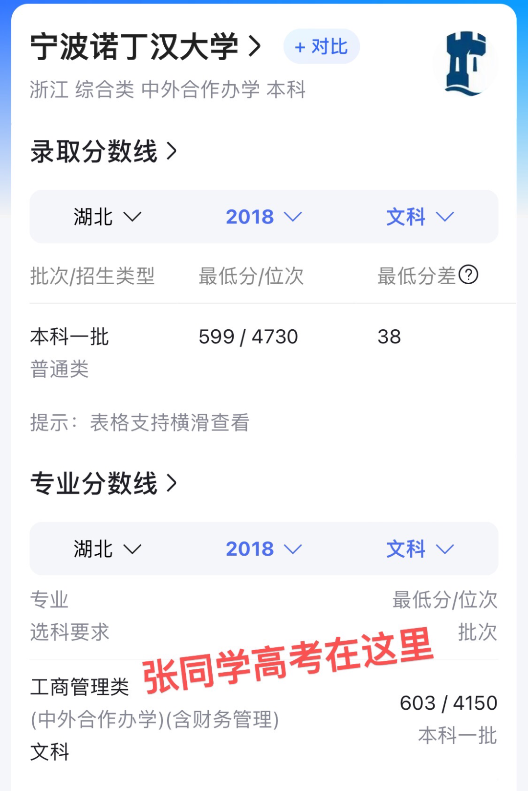 有一说一,宁波诺丁汉大学虽然名字看起来比较野鸡,但实际上是名副其实的一本高校,也是英国诺丁汉大学正经授权的中外合办学校。不算很厉害,但好歹是正规一本高校。张同学当年高考成绩应该是超出文科一本线40多分的样子。