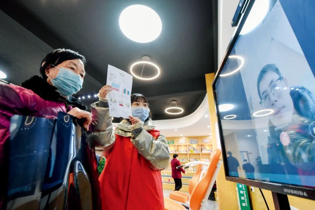 2022年12月14日,浙江湖州市长兴县画溪街道,姚家桥村区域型居家养老服务中心内,老年人在志愿者陪伴下进行网络远程问诊。图/中新